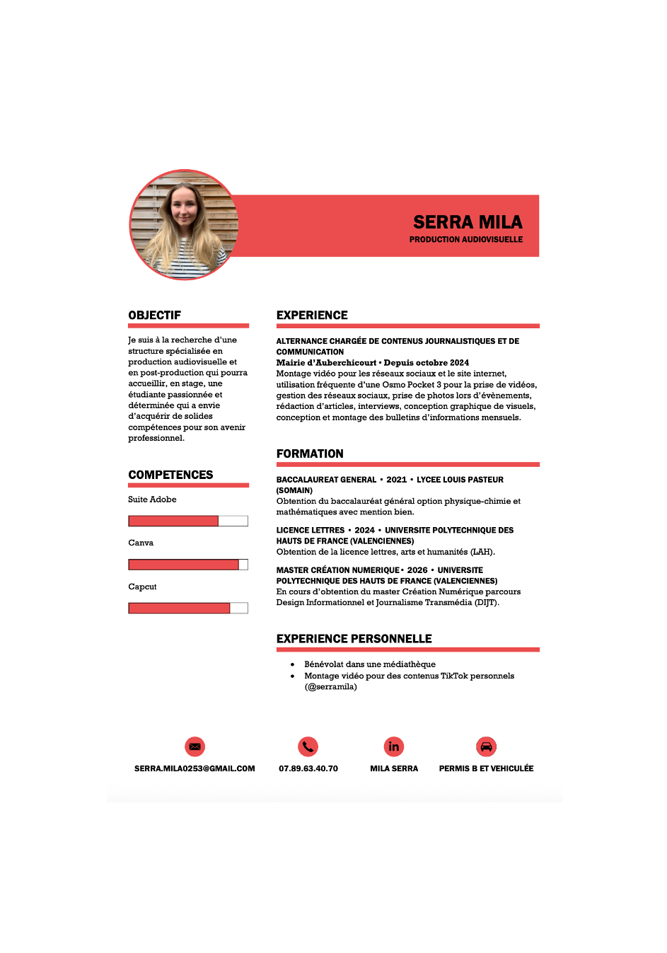 Étudiante en deuxième année de Master Création Numérique, c'est grâce à ces études que j'ai découvert le monde de l'audiovisuel. Pour mes examens, j'ai réalisé plusieurs projets qui m'ont réellement animés : reportages, bande annonce, déclinaison pour les réseaux sociaux, ... Ces travaux m'ont permis d'acquérir de solides compétences en pré-production jusqu'à la post-production.